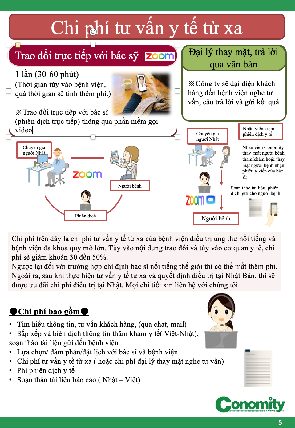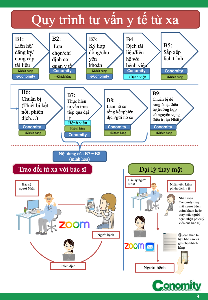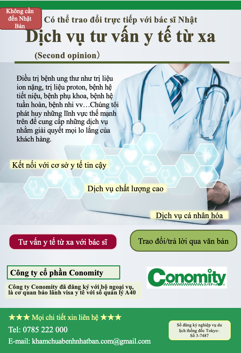 Tư vấn Y tế từ xa là dịch vụ thông qua cuộc gọi video online, người bệnh có thể trực tiếp trao đổi với bác sĩ nước ngoài và nhận được thông tin y tế hoặc ý kiến y tế. Cụ thể là người bệnh cung cấp trước những thông tin y tế cần thiết và nội dung trao đổi với bác sĩ. Vào ngày được đặt hẹn, thông qua ứng dụng như ZOOM để trao đổi, xin ý kiến y tế thứ hai, và nhận được những thông tin y tế khác. ( Trao đổi, tư vấn y tế hoặc dịch vụ ý kiến y tế thưc hai không được cấp giấy chẩn đoán và đơn thuốc).