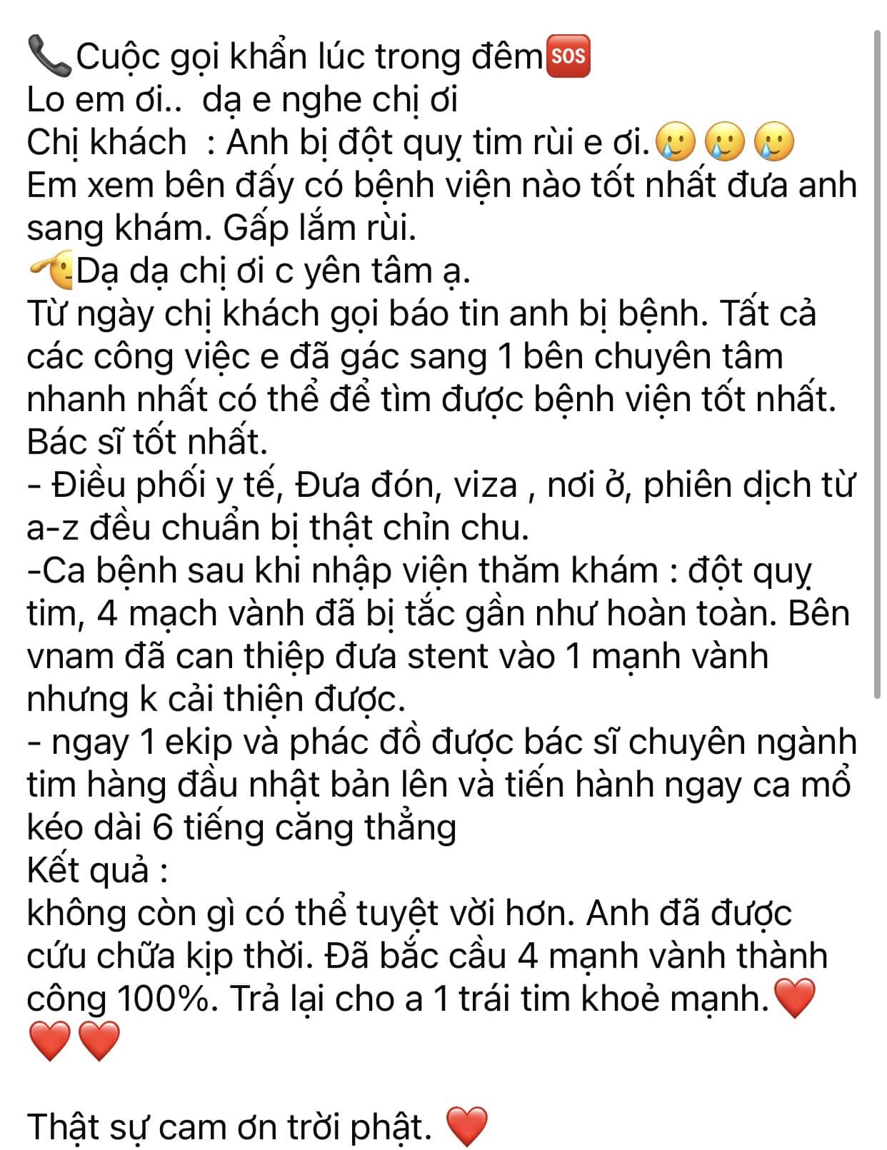 Cá nhân mình là người hỗ trợ, theo sát anh trong suốt 15 ngày qua, trải qua nhiều cung bậc cảm xúc không thể diễn tả thành lời. Thật vui mừng khi ca phẫu thuật thành công 100%, giúp anh có một trái tim khỏe mạnh.