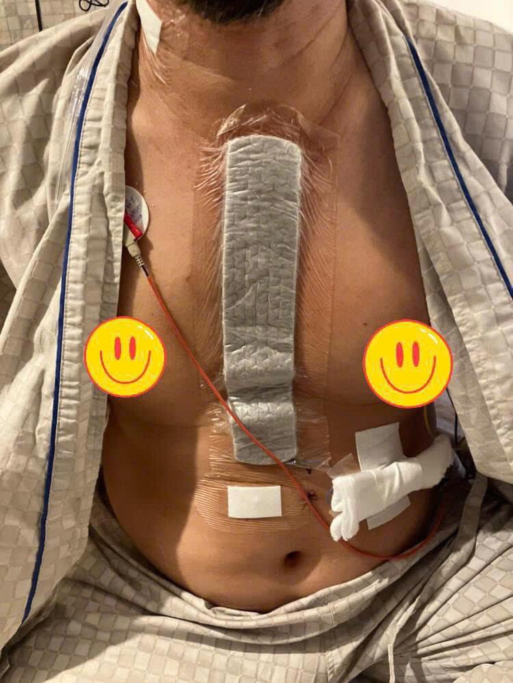 Do anh đã đặt stent và đang sử dụng thuốc chống đông, ca phẫu thuật phải lùi lại 10 ngày sau khi ngừng thuốc. Trong thời gian này, anh được nghỉ ngơi và chăm sóc trực tiếp tại bệnh viện, đồng thời làm thêm một số xét nghiệm phục vụ cho ca phẫu thuật sắp tới. Đến 12h35 ngày 28 tháng 10, anh được đưa vào phòng mổ với tâm trạng đầy lo lắng, vì đây là lần đầu tiên anh phải trải qua ca đại phẫu mở toàn bộ phần ức (như trong ảnh). Lý do là vị trí bắc cầu động mạch của anh nằm ở ba điểm khác nhau, khiến bác sĩ không thể tiến hành phẫu thuật xâm lấn tối thiểu.